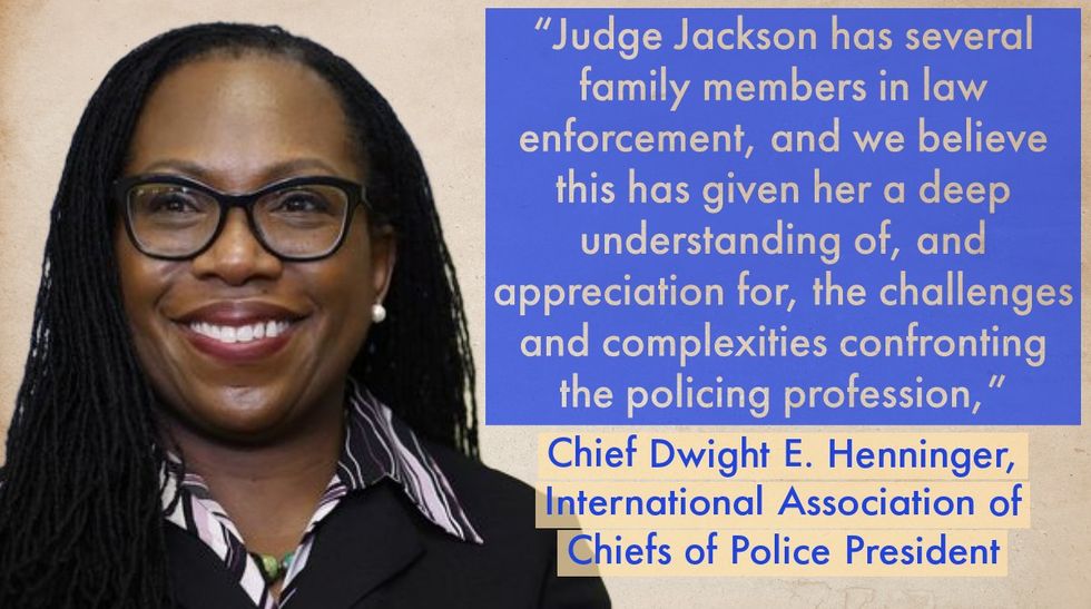 Judge Ketanji Brown Jackson has earned the enthusiastic support of the International Association of Chiefs of Police for her understanding of law enforcement and her fair decisions. She's exactly what we need: #AJustice4All https://t.co/PRDuXudJLe
