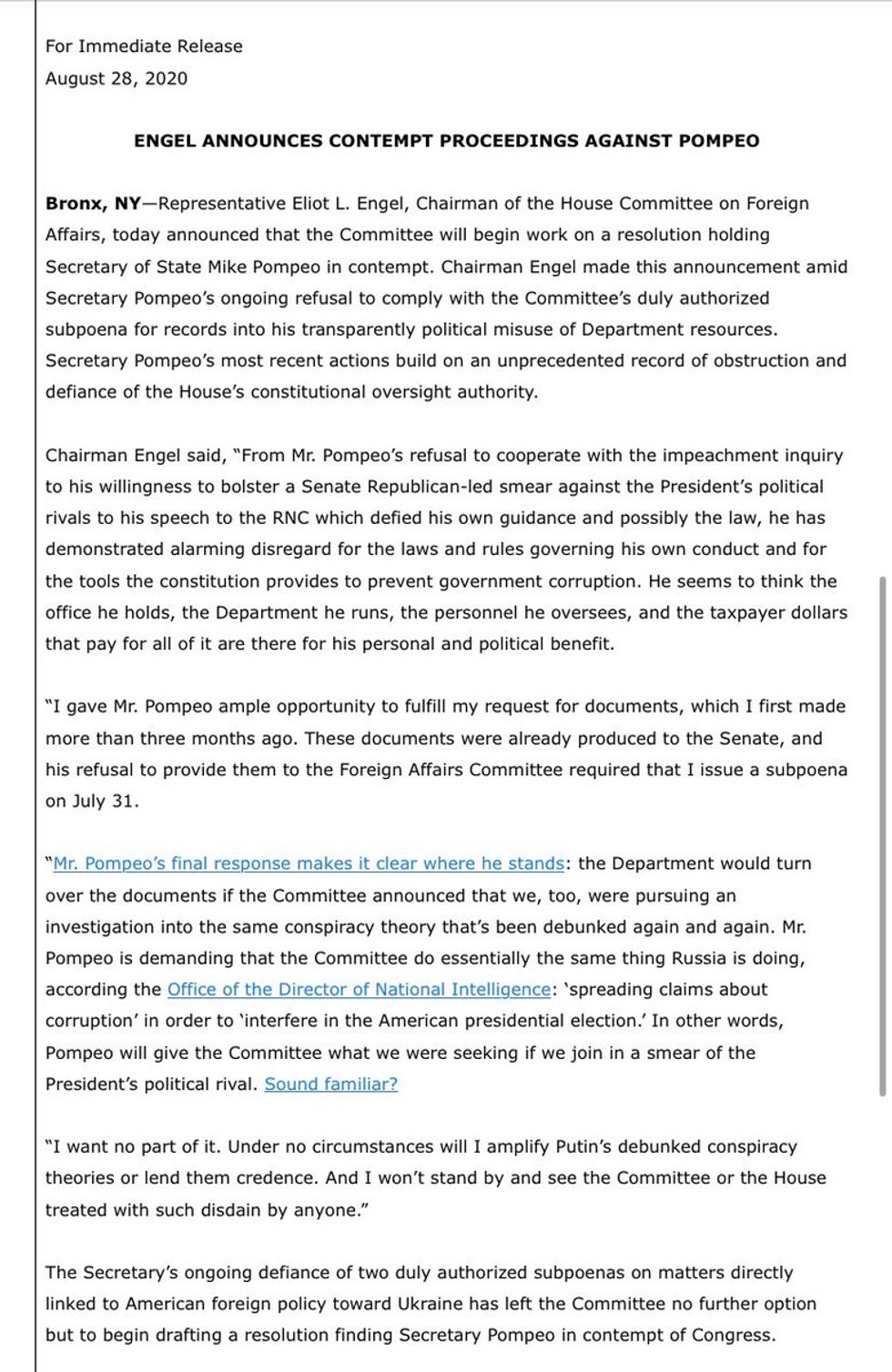 Just in: House Foreign Affairs chairman Eliot Engel announces that the committee “will begin work on a resolution holding Secretary of State Mike Pompeo in contempt” over his defiance of subpoenas issued by the panel https://t.co/4ZTGxWJwBB