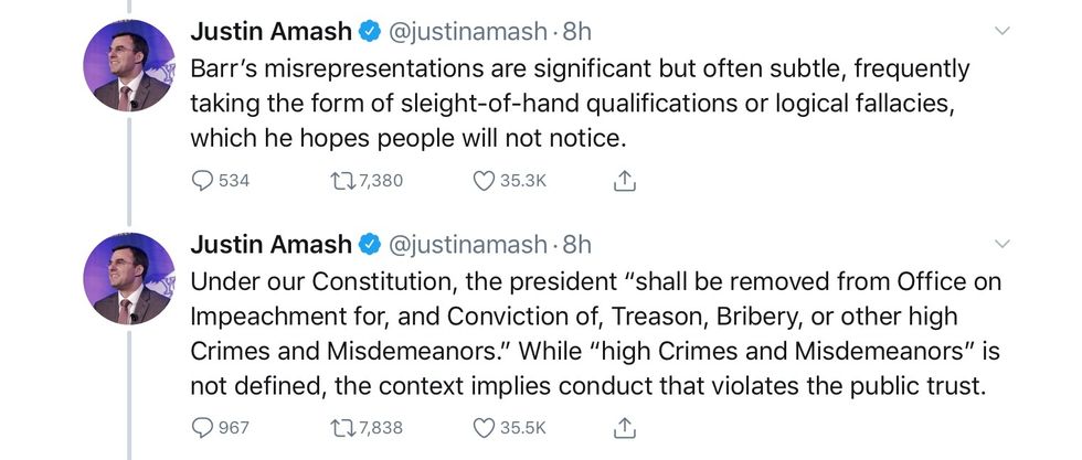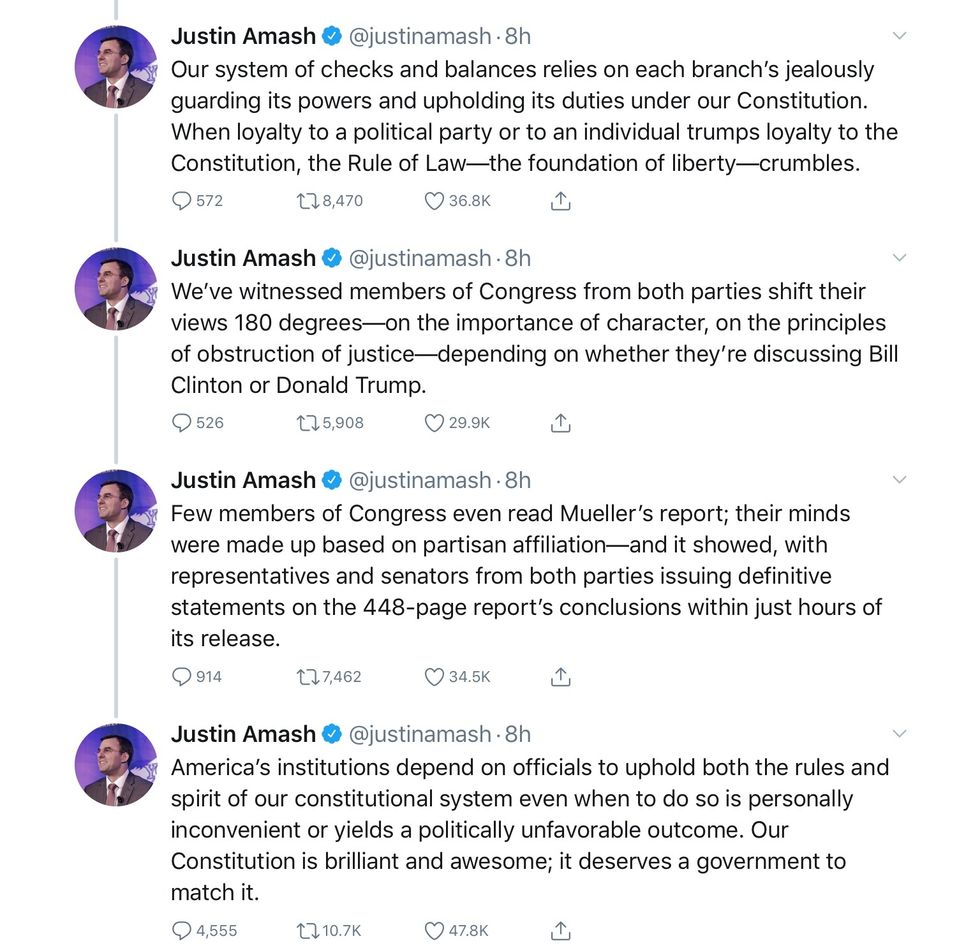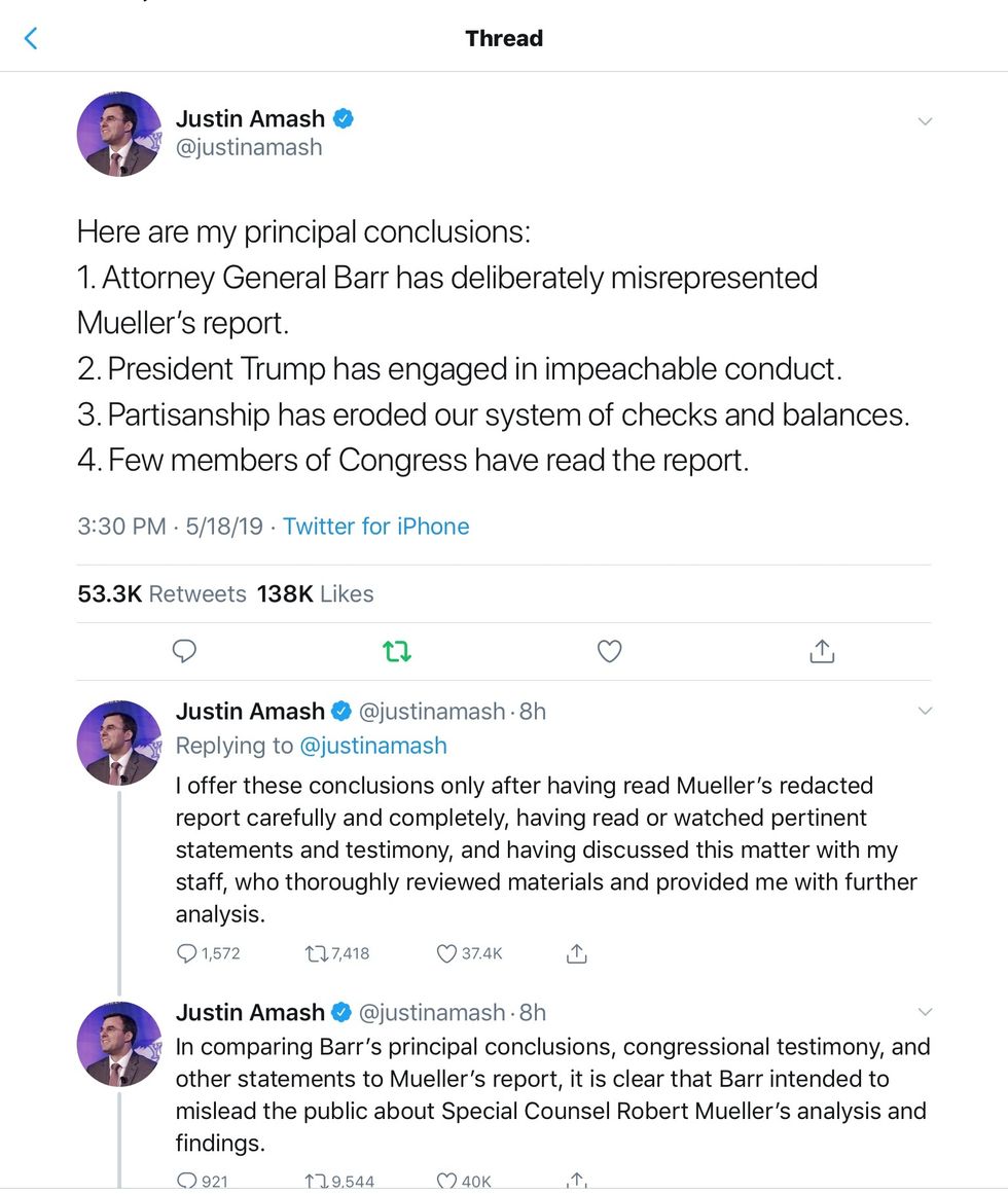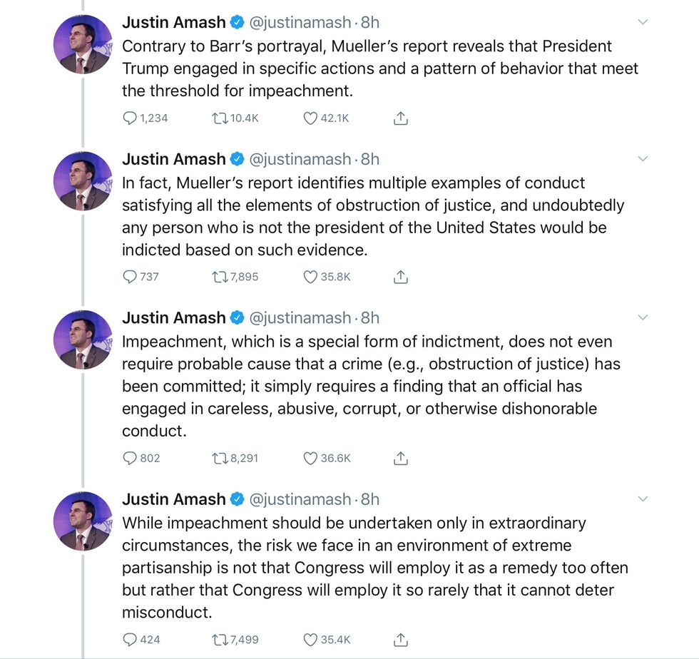 Here are Congressman Amash’s tweets, explaining what led him to conclude, yes, “Trump has engaged in impeachable conduct.” Yes, he read the redacted Mueller report. Here is his thread.