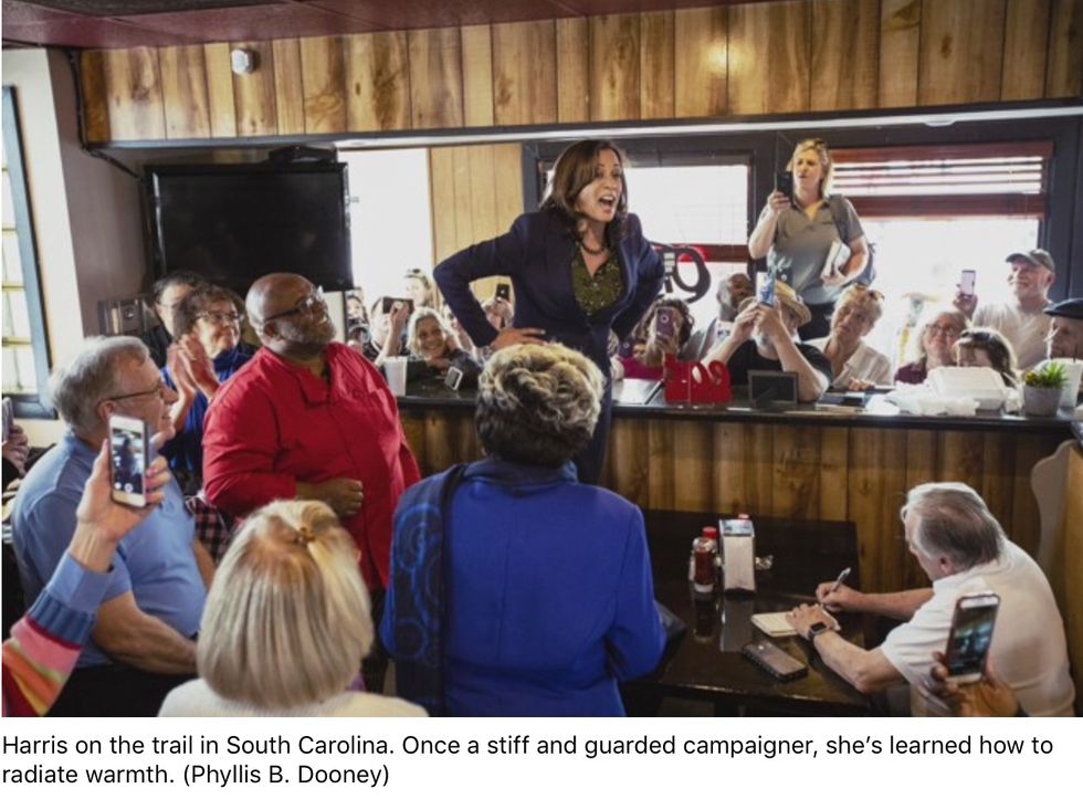 It's all happening before you can even see her, so thick and aggressive is the press: the 20-plus reporters with TV cameras, boom mics, lenses larger than some dogs. Kamala shakes Scott's hand; touches his arm; smiles her big, open, I-am-so-happy-to-be-with-you-right-now smile. She's shorter, even in heels, than one expects. But she's magnetic, authoritative, warm—leaning in, nodding, gesturing with both hands, moving those hands from a voter's biceps or shoulder to a position of deep appreciation over her heart.