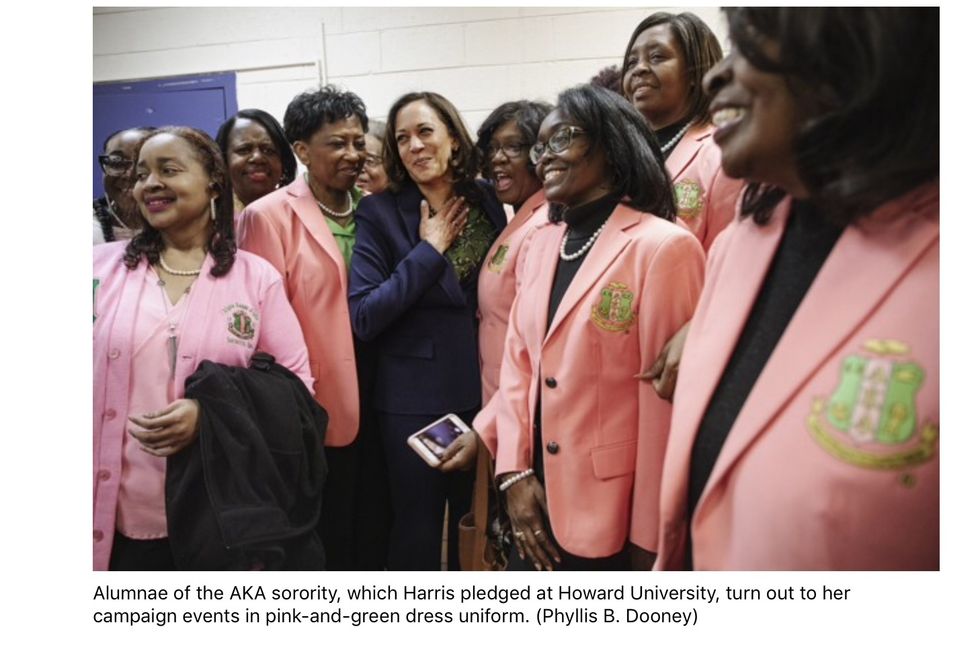 When Harris was in middle school, Shyamala took a post at McGill University and moved with her daughters to Montreal. Harris attended high school there. At Howard University, in Washington, D.C., she chaired the economics society, argued on the debate team, and pledged the AKA sorority, the first black sorority in the country, whose alumnae show up at Harris's campaign events in force, dressed in AKA pale pink and green, a squadron of extra aunts. At UC Hastings College of the Law, in San Francisco, Harris "found her calling," as she writes in her memoir, and decided to become a prosecutor.
