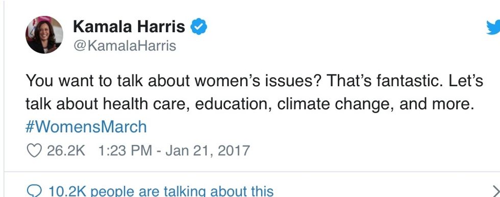 During a speech at the 2017 Women's March, Harris implored the nation to prioritize women's issues, which she says include things like the economy, national security, healthcare, education, criminal justice reform, and climate change.
