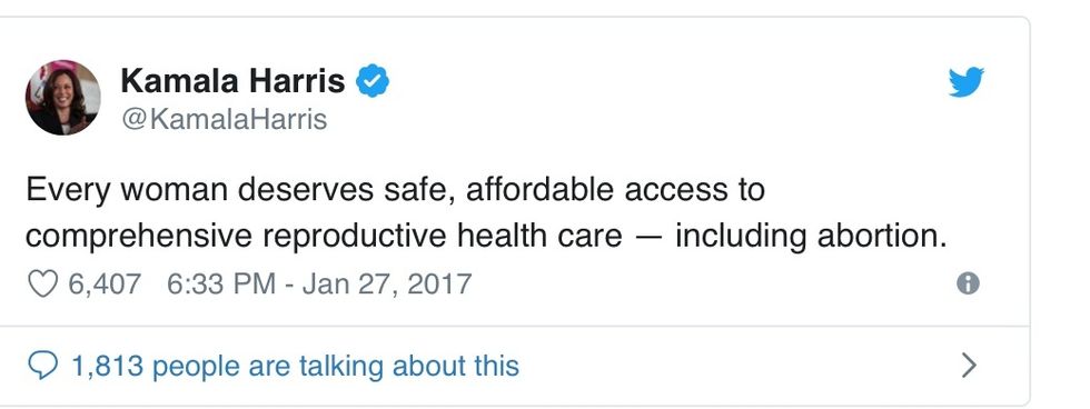 She's also continuously been pro-choice and has been supported by Planned Parenthood. When she was elected to the U.S. Senate, Cecile Richards, then-President of Planned Parenthood, said, "Congratulations to Kamala Harris on her victory. Kamala Harris is a staunch advocate for women's health and rights. She ran proudly on an agenda to expand access to reproductive health care, and her victory shows that voters demand their elected officials protect women's health and rights."