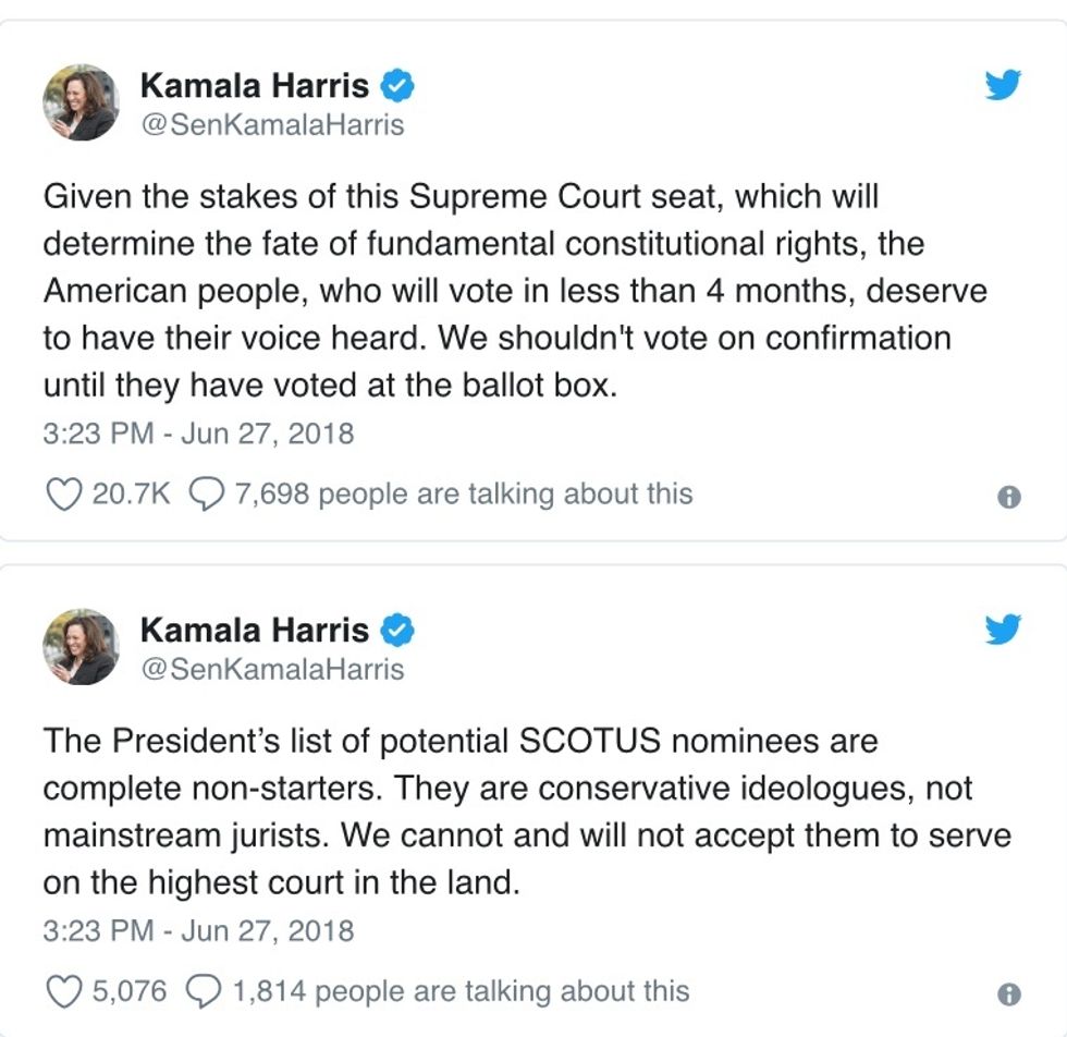 "Given the stakes of this Supreme Court seat, which will determine the fate of fundamental constitutional rights, the American people, who will vote in less than 4 months, deserve to have their voice heard," Harris tweeted. "We shouldn't vote on confirmation until they have voted at the ballot box."