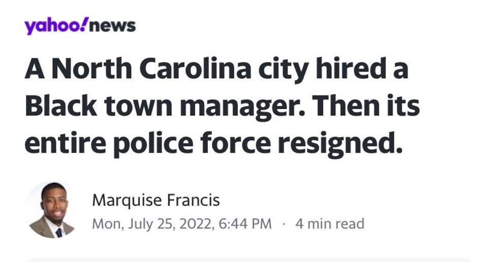 Kenly, North Carolina. Hired new City Manager. Justine Jones. Black. Woman. Entire all-white police department resigns. Claim 'hostile work environment' yet to provide no support. A long-time resident says: “They don’t want to be led by anybody Black; that’s Kenly.” Wow. https://t.co/5fvvAvBR43