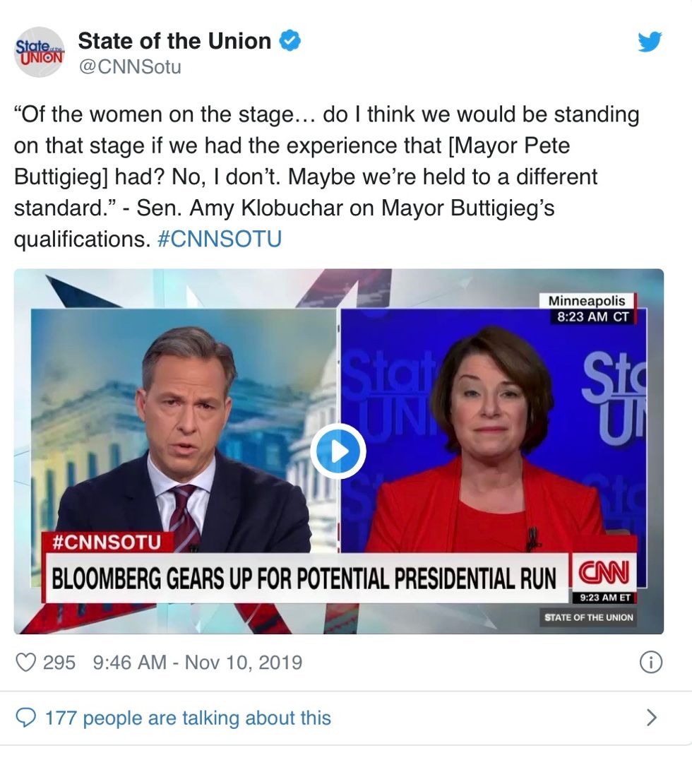 Sen. Amy Klobuchar (D-Minn.) said Sunday that women in politics are held to a higher standard than men, arguing that a female candidate with South Bend, Ind., Mayor Pete Buttigieg's experience probably would not make it to the presidential debate stage.