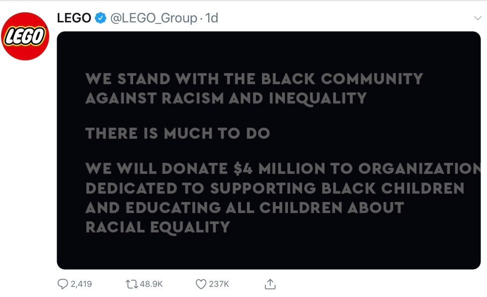 On Wednesday, June 2, Lego announced on Twitter that it would donate $4 million to "organizations dedicated to supporting black children and educating all children about racial equality."