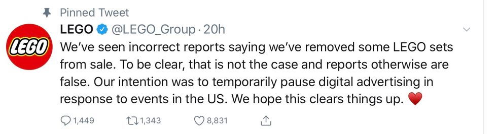 Lego is taking a firm stand in support of protestors and the Black Lives Matter movement.