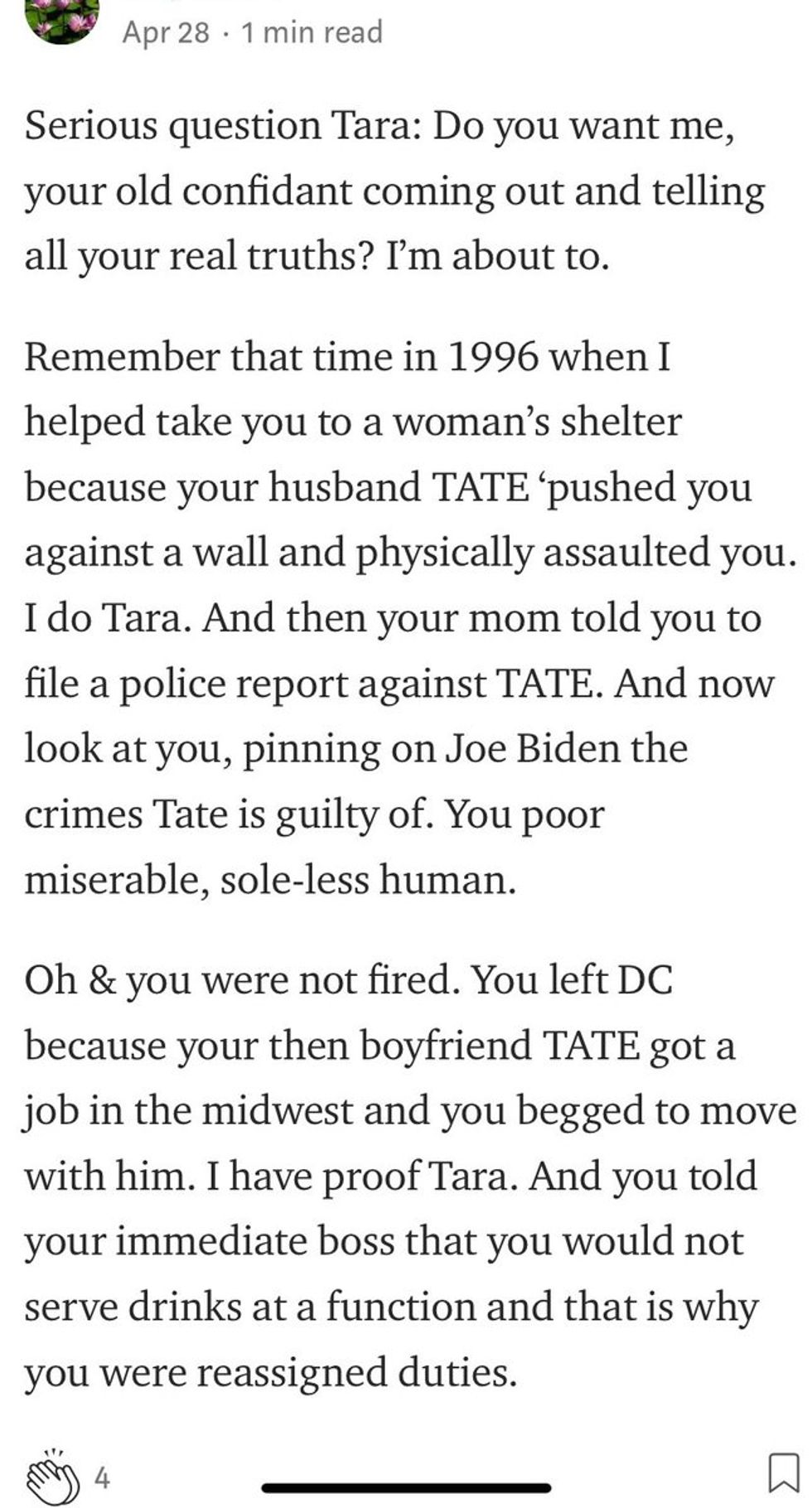 Looks like one of Tara's old friends has shown up to call bullshit on her entire fucking story.