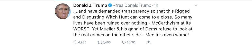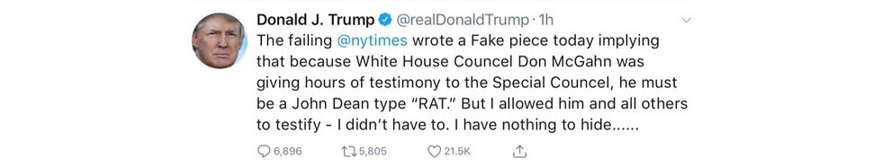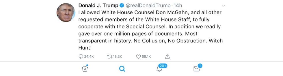 Add On. The crazy one in the White House has heard about McGahn and Mueller. The tweets began this am but the length of the sentences suggest someone else wrote or helped on the tweets.