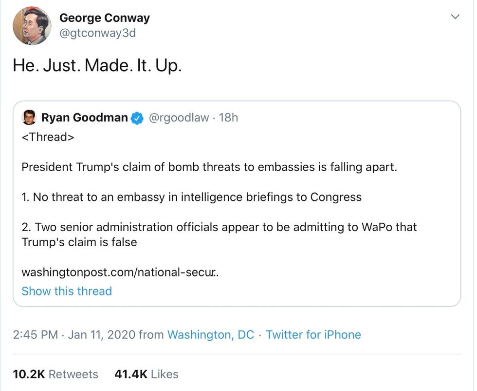 An aside, Trump has shown he will do anything to keep holding power, including putting the wold at the brink of war. We saw him do that in the Middle East. There was no “imminent danger."