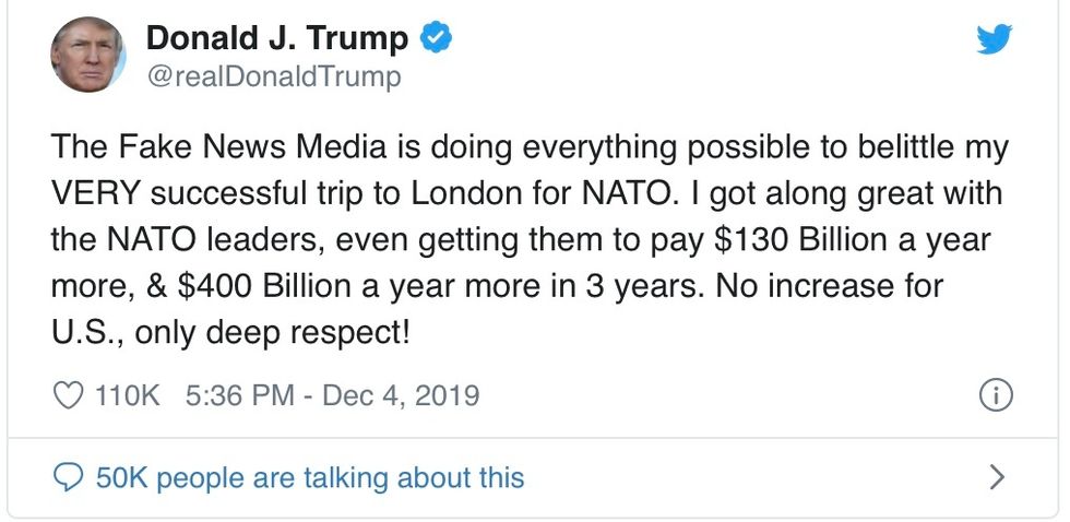 "The Fake News Media is doing everything possible to belittle my VERY successful trip to London for NATO," he wrote on Twitter as Air Force One streaked across the Atlantic. "I got along great with the NATO leaders," he added, claiming credit for persuading them to increase their military spending, although wildly inflating the actual numbers. "No increase for U.S., only deep respect!"