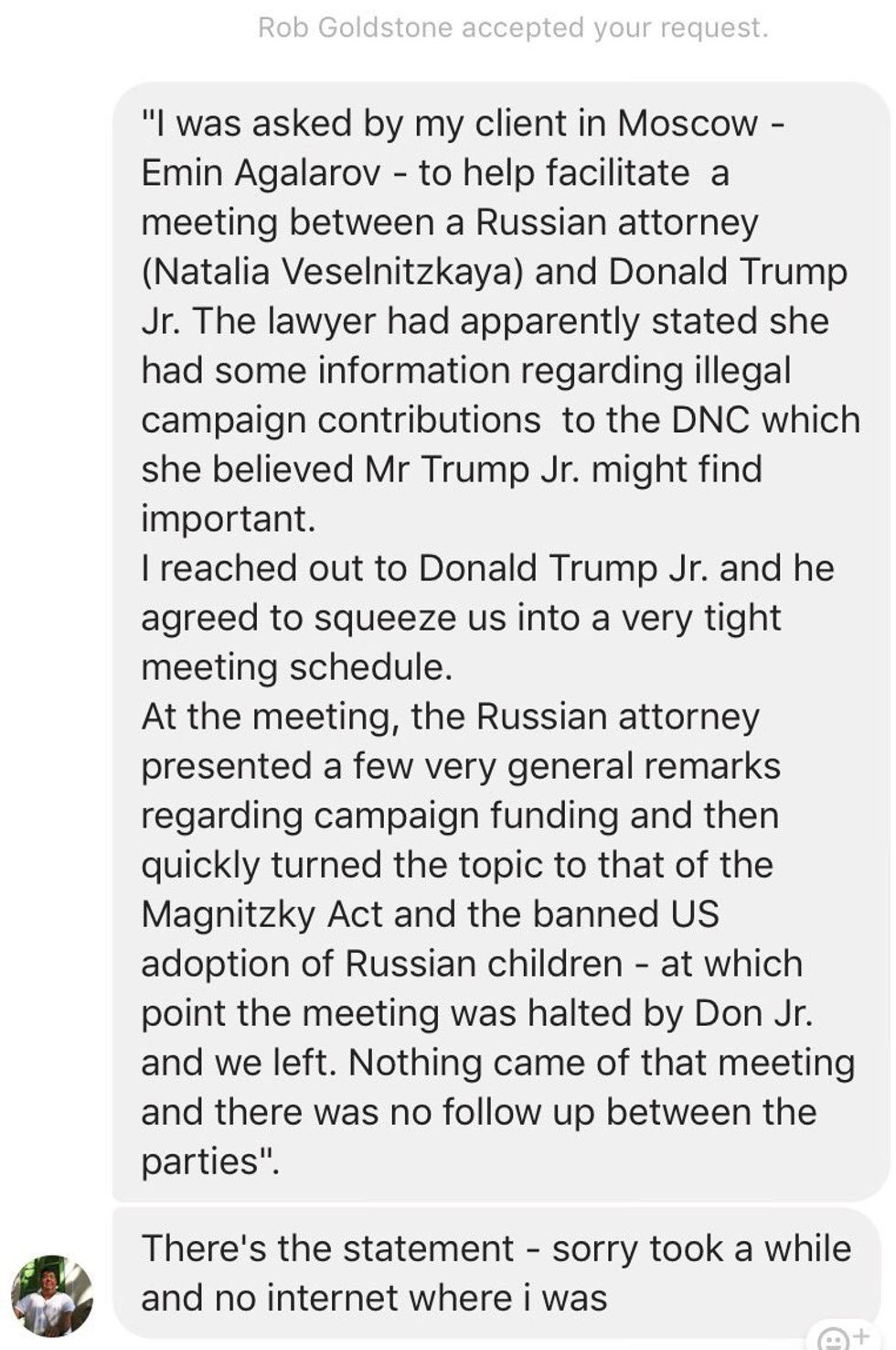 Goldstone, in turn, told the Post that "he had arranged the meeting at request of a Russian client." He refused to disclose the name of the client, but Goldstone is the manager for a Russian pop singer named Emin Agalarov.