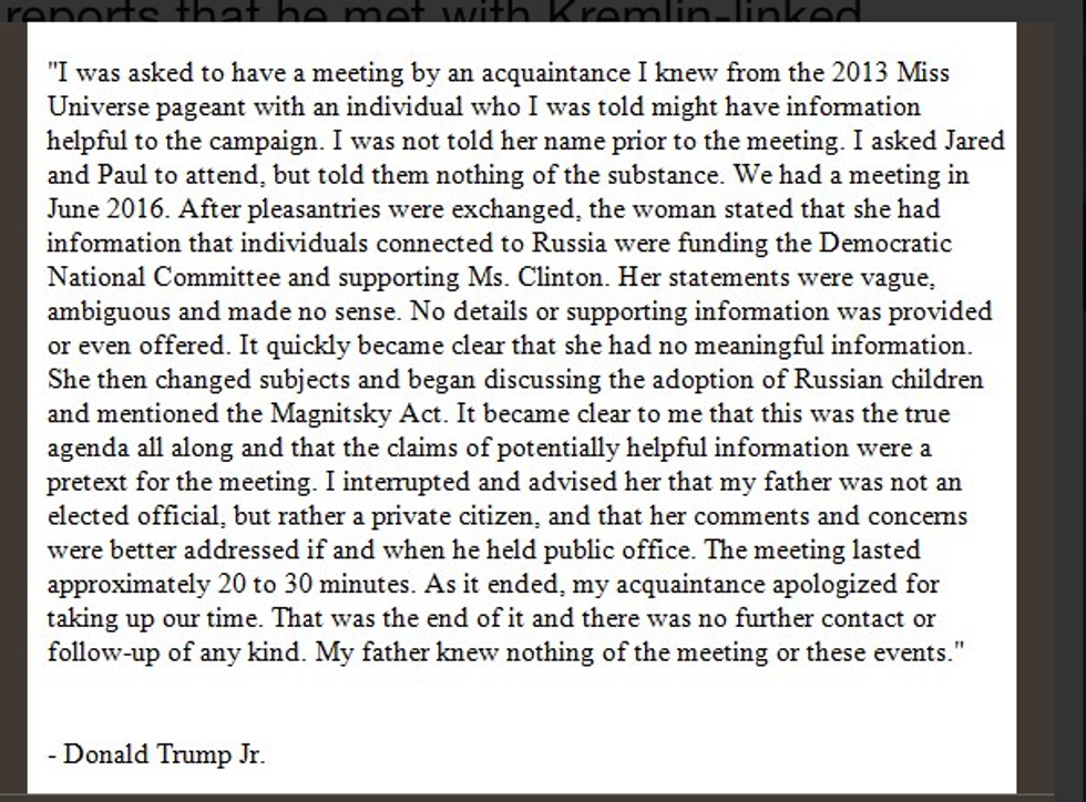 Trump Jr. admitted that he took a meeting with a Kremlin-connected Russian lawyer with the expectation that she would provide him with information damaging to Hillary Clinton. He brought along Paul Manafort, Trump's campaign manager at the time, and Jared Kushner, Trump's son-in-law and a top adviser.