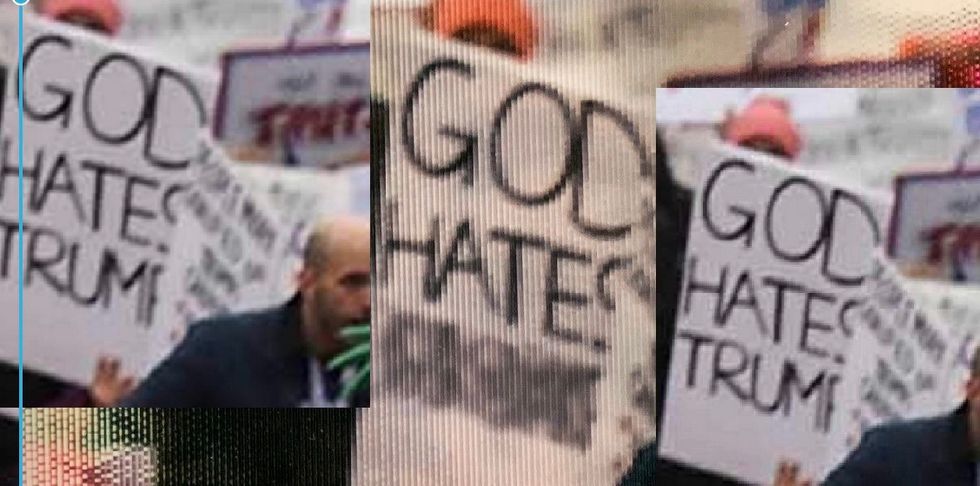 A placard that proclaims "God Hates Trump" has "Trump" blotted out so that it reads "God Hates." A sign that reads "Trump & GOP — Hands Off Women" has the word Trump blurred out.