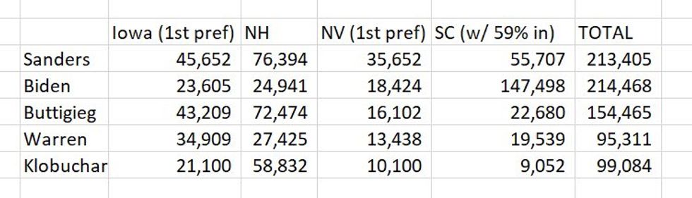 National popular vote: (With 59% SC votes in): Biden 213,468 Sanders 213,405 Buttigieg 154,465 Klobuchar 99,084 Warren 95,311 https://t.co/2NmAtHUxdB
