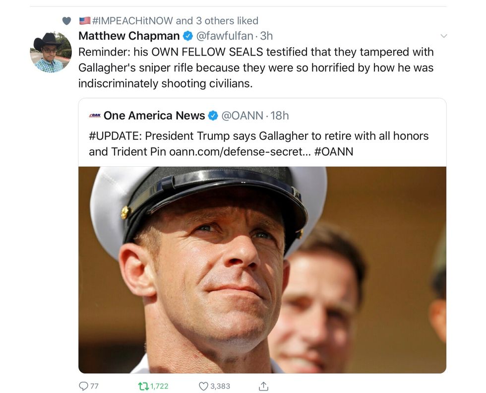 In the days afterward, the tensions between the Pentagon and the White House became concentrated on Gallagher, whose cause had been taken up by Fox News' personalities. After military officials started Gallagher's review, Trump vowed on Twitter that he would never permit the Navy to revoke the Gallagher's membership of the elite group.