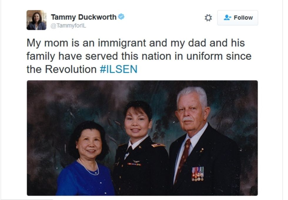 More recently, Kirk has been under fire for attacking Duckworth's heritage as a "daughter of the American Revolution." - "I had forgotten that your parents came all the way from Thailand to serve George Washington," he said. Duckworth was born in Thailand to an American father and a mother of Chinese heritage, and is, in fact, a member of the DAR.