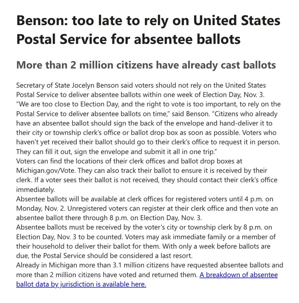 NEWS: Sec. of State @JocelynBenson advises Michigan voters NOT to rely on USPS at this stage. "Citizens who already have an absentee ballot should sign the back of the envelope and hand-deliver it to their city or township clerk’s office or ballot drop box as soon as possible." https://t.co/tQ2RueXsmW
