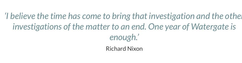 Describing it as "a personal word" added to the main body of his 1974 state of the union address, on the heels of a lengthy ovation following his expression of hope that a freshman lawmaker in the chamber that evening might one day look back at having begun his career during a Congress that ended America's then–longest war and set it on a path toward its longest peace, President Richard Nixon took up the topic of "the so-called Watergate affair" on his own terms: