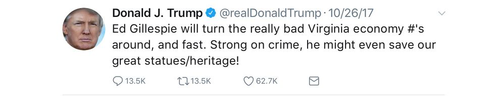 Whether to leave or remove Confederate statues may be a genuine disagreement — Mr. Gillespie would leave them; Ralph Northam, his Democratic opponent, would remove them; neither could decide in most cases, which are under local control. But for Mr. Gillespie to whip up passions by stressing the issue immediately after the violence in Charlottesville has been to appeal to those for whom "heritage" and "tradition" are racist buzzwords.