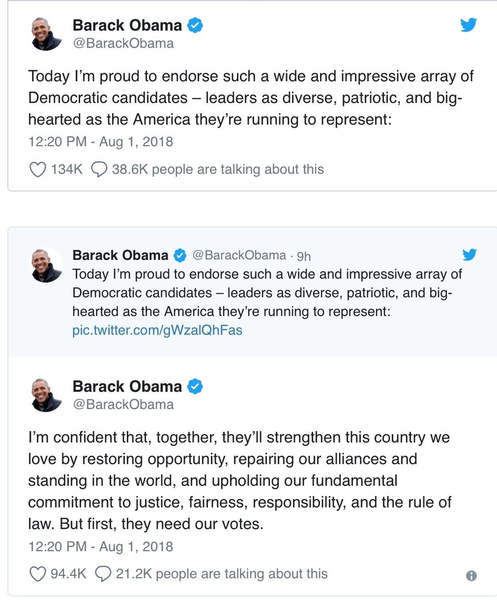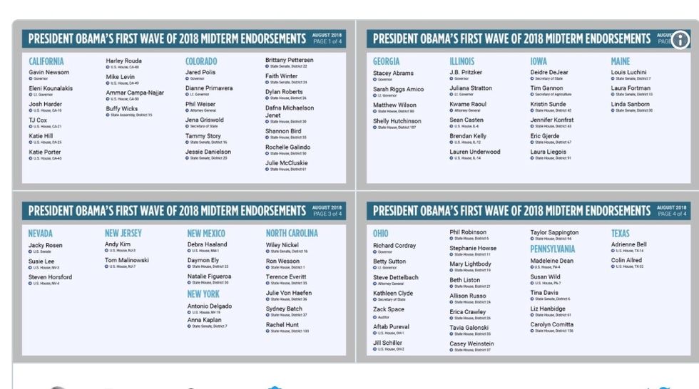 Obama in a series of tweets listed candidates in more than a dozen states he's backing in 2018. "Today, I'm proud to endorse such a wide and impressive array of Democratic candidates — leaders as diverse, patriotic, and big-hearted as the America they're running to represent," he wrote.