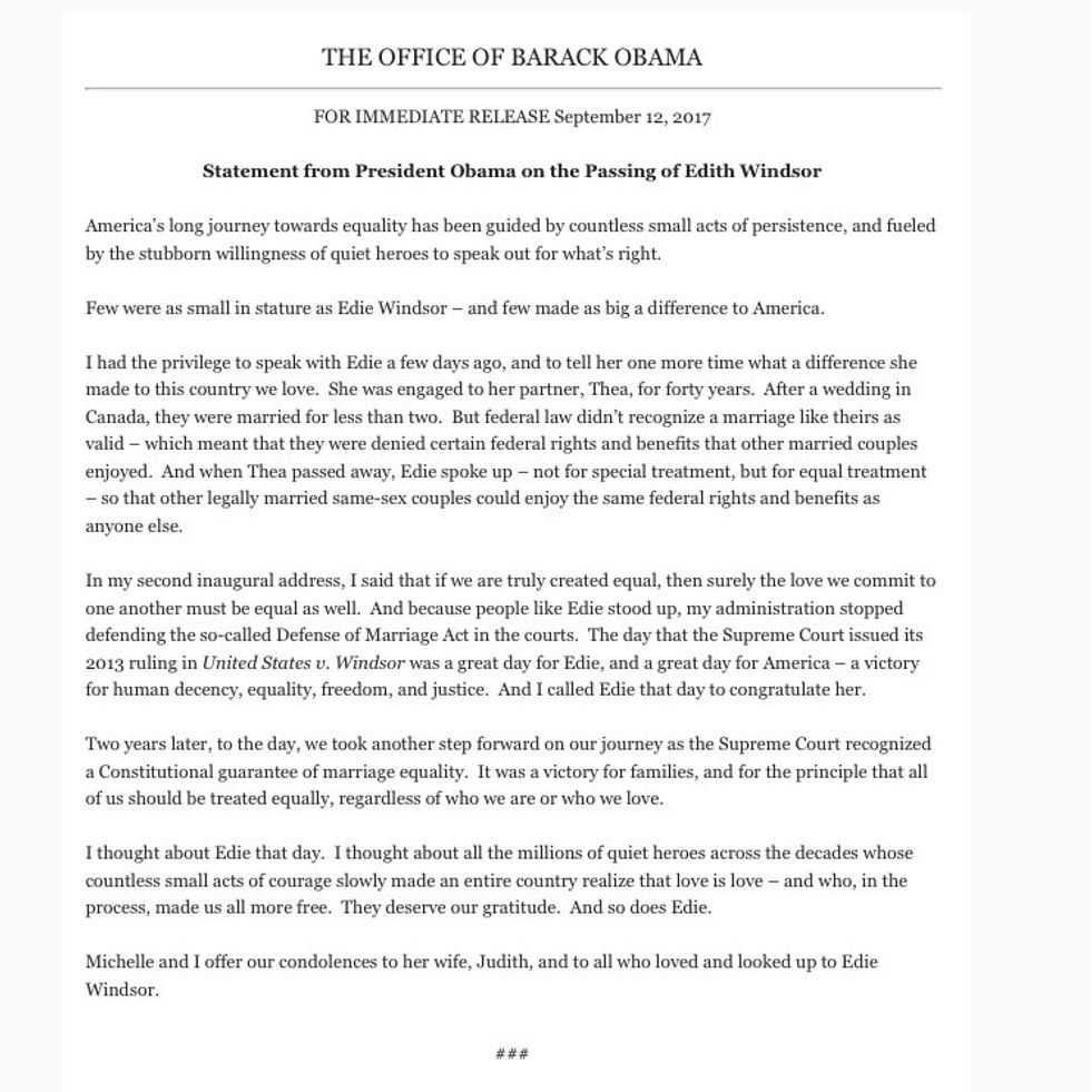 Obama statement on the passing of Edith Windsor https://t.co/Avj9vQqhtz