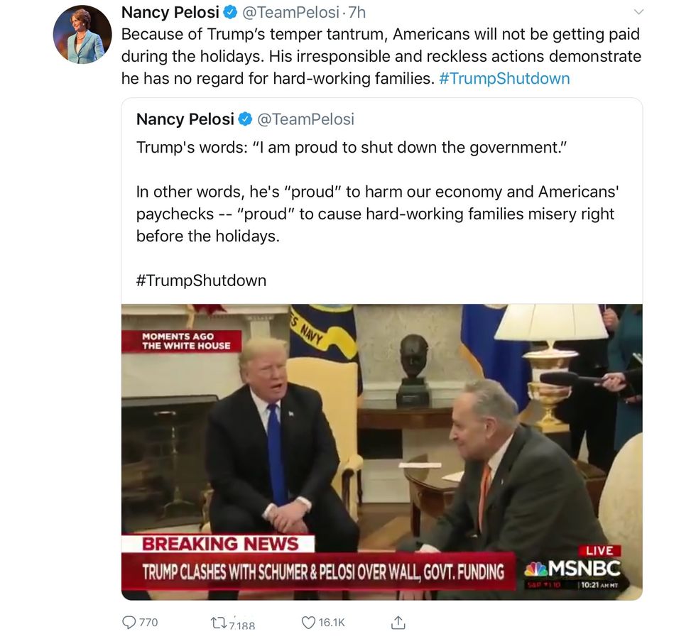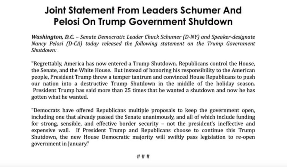 On Wednesday, the Senate unanimously passed a clean Continuing Resolution (CR) to keep the government funded through February 8. Following a few hours of critical (racist, xenophobic) Fox News headlines and Ann Coulter tweets, Trump announced he wouldn't sign it. And showing exactly why they just lost the midterms, House Republicans gave in to Trump's temper tantrum and passed a bill (literally in the last hours of their majority) that contained nearly $6 billion in wall funding.
