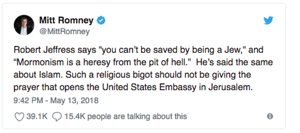 After the pastor said on Fox News over the weekend that he would give the opening prayer at the embassy ceremony, Mr. Romney called him a "religious bigot."