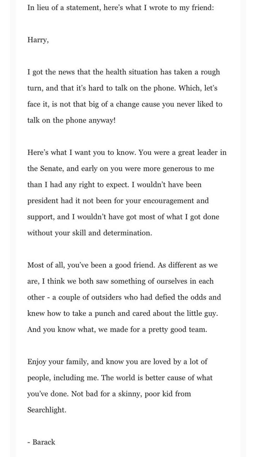 President Obama says when Harry Reid was nearing the end, his wife Linda asked some to share letters that she could read to him. In lieu of a statement, Obama shares his letter to Reid: https://t.co/ea2PRk6cxi