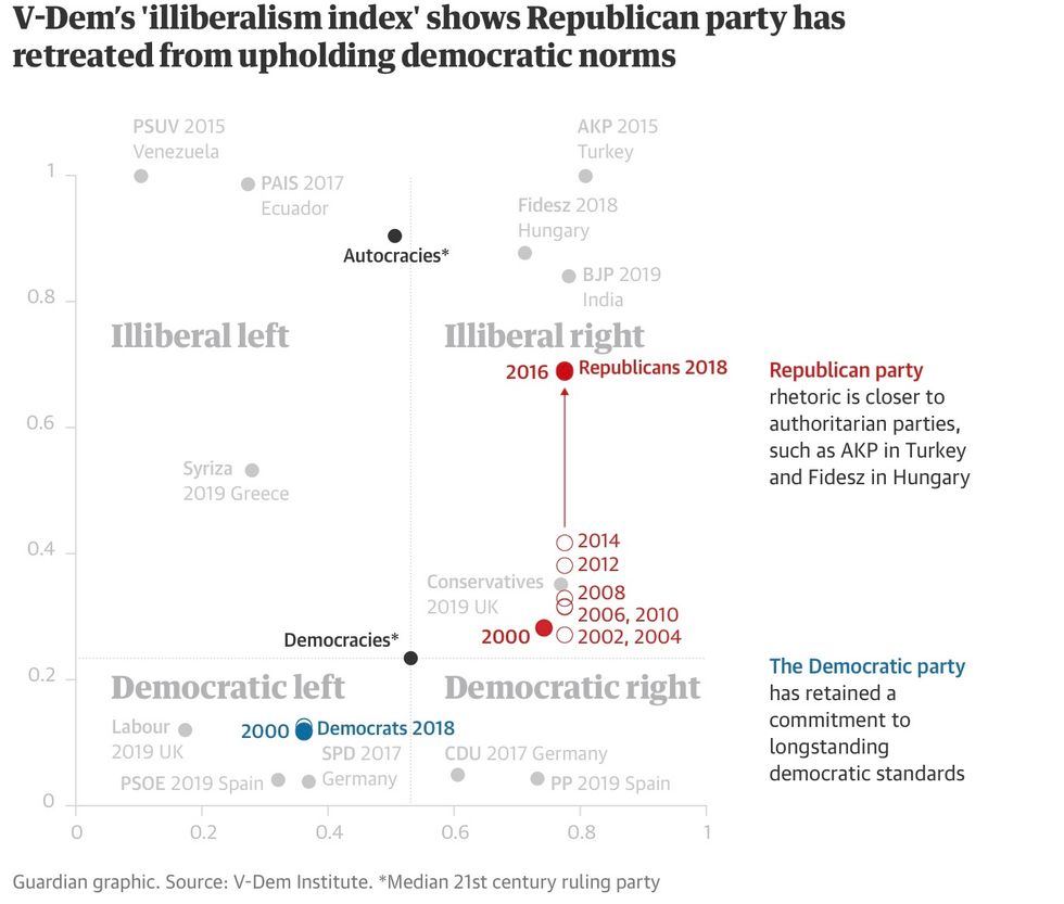 "The data shows that the Republican party in 2018 was far more illiberal than almost all other governing parties in democracies," the V-Dem study found. "Only very few governing parties in democracies in this millennium (15%) were considered more illiberal than the Republican party in the US."