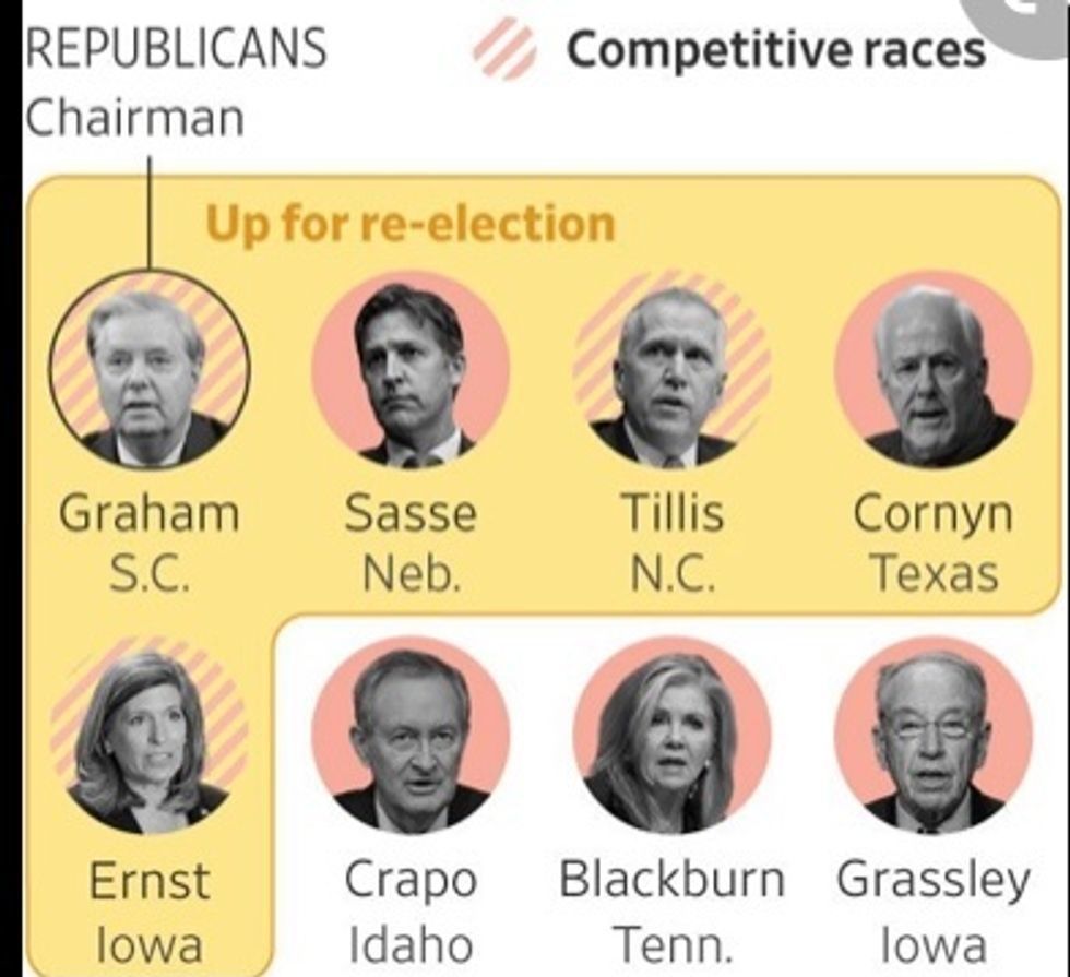 Replace Graham with Jaime Harrison, Sasse with Chris Janicek, Tillis with Cal Cunningham, Cornyn with MJ (Mary Jennings) Hagar, Ernst with Theresa Greenfield.