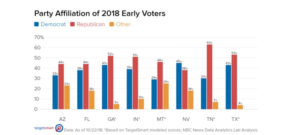 In Texas — where Republican Sen. Ted Cruz is attempting to hold off Democratic Rep. Beto O'Rourke — 53 percent of early voters had a Republican affiliation, compared with 43 percent who had a Democratic affiliation and 4 percent who were not affiliated with either party.