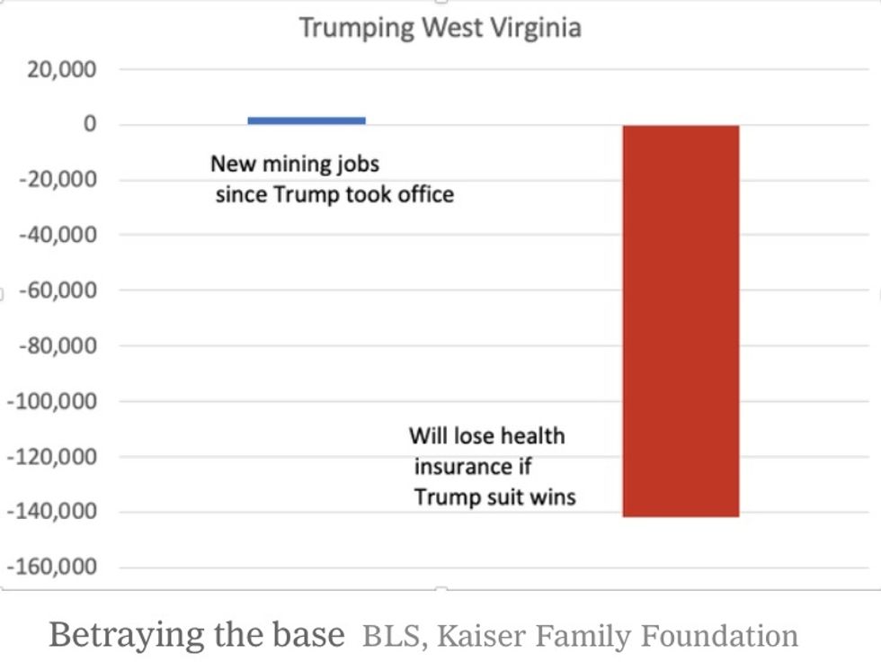 As an aside, this latest Trump move completes his utter betrayal of the people who put him in office. Consider a place like West Virginia, where a lot of people gained health insurance thanks to Obamacare's Medicaid expansion. The state went overwhelmingly for Trump anyway, because he promised not to cut health care, and also promised to bring back those good jobs in coal. So I made a little chart to show what he's actually offering West Virginians: