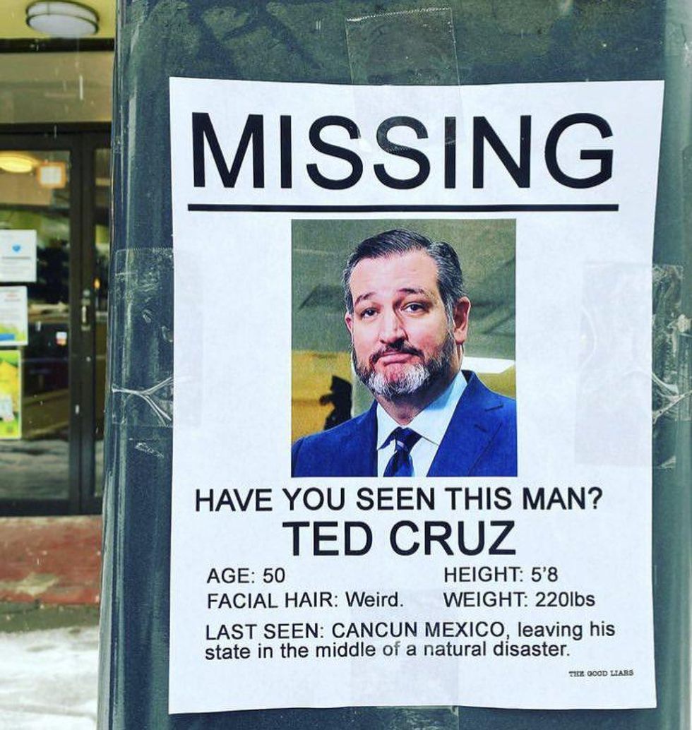 Voices4America Post Script. Senator Ted Cruz left Texas for Cancún as 3.5 million Texas have no electricity, heat and water. This makes me so mad that I can hardly speak. #CancunCruz #NeverForget Share this so everyone knows.