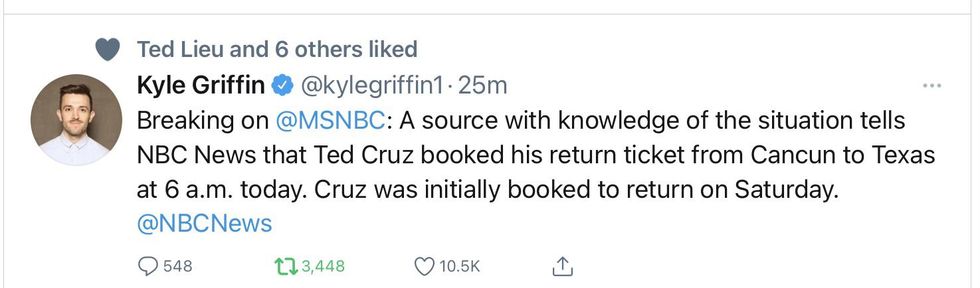 Mr. Cruz himself had posted updates throughout Wednesday on Twitter about the intensity of the winter storm from the National Weather Service. "Stay safe and please continue to follow the warnings and updates provided by state and local officials," he wrote on Wednesday morning.