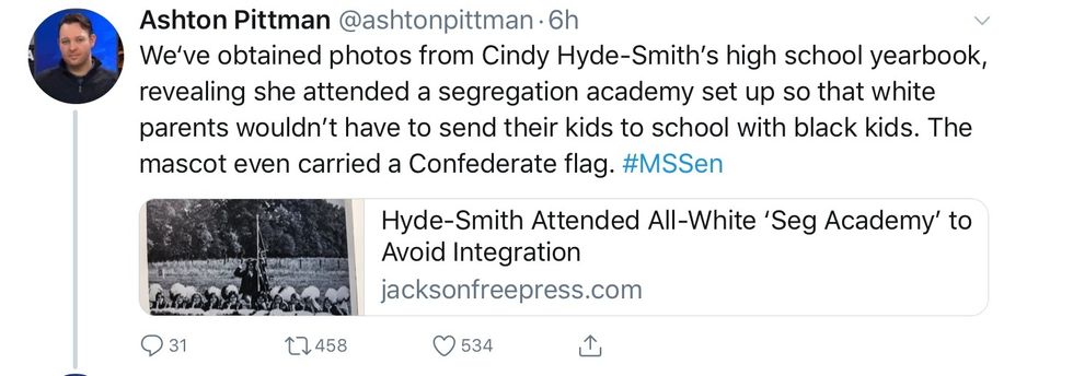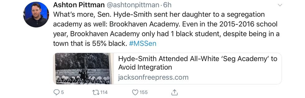 Since the video surfaced, Hyde-Smith also was captured on video saying it would be a good idea to make it harder for some college students to vote. A 2014 photo of Hyde-Smith donning a Confederate hat has created controversy in Mississippi as well.