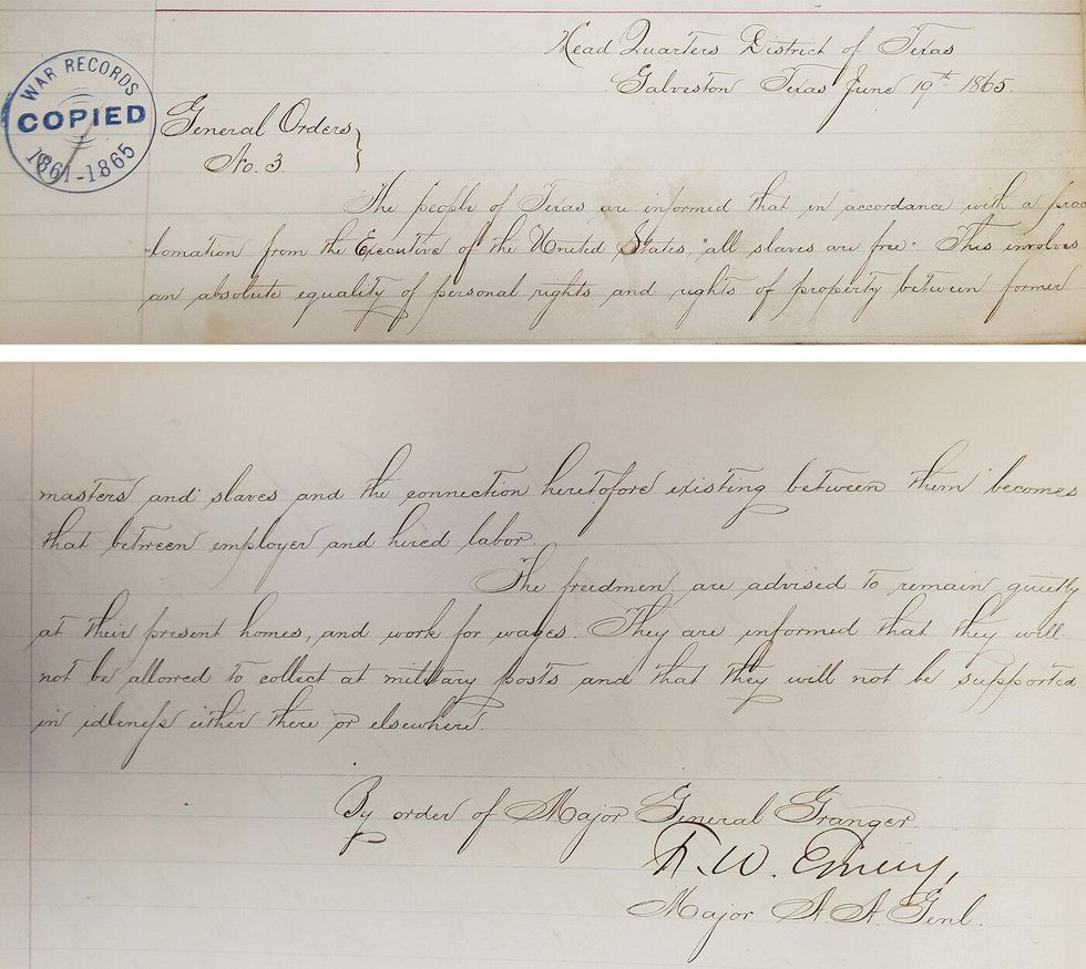 "The people of Texas are informed that in accordance with a Proclamation from the Executive of the United States, all slaves are free. This involves an absolute equality of rights and rights of property between former masters and slaves, and the connection heretofore existing between them becomes that between employer and hired laborer," the order reads, in part.