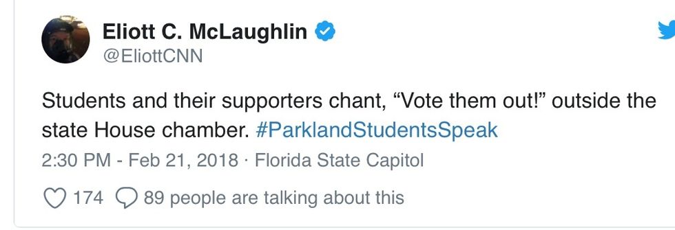 And in Tallahassee, Stoneman Douglas students who survived the Parkland shooting massacre chanted louder than ever: "Vote them out!" Their words echoed through the hallways of the state Capitol, where they demanded a ban on weapons like the one used to kill their friends and teachers.