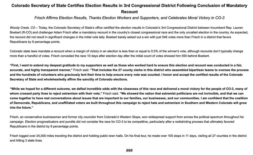 I want to thank the volunteers for their efforts during this state-mandated recount. We are all proud of Colorado’s safe and secure elections. 🇺🇸 https://t.co/3nLDBnxeYf