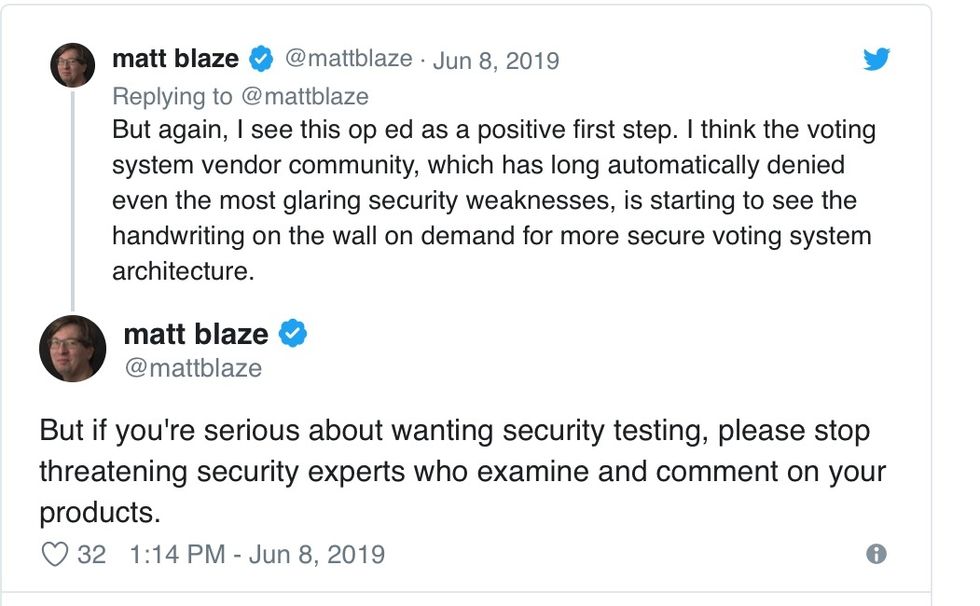 "I see this op ed as a positive first step. I think the voting system vendor community, which has long automatically denied even the most glaring security weaknesses, is starting to see the handwriting on the wall on demand for more secure voting system architecture," Blaze wrote. "But if you're serious about wanting security testing, please stop threatening security experts who examine and comment on your products."