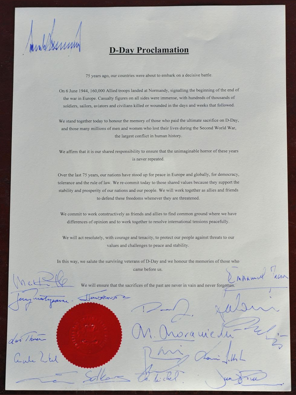 This makes the point too. @Axios wrote: President Trump puts his autograph up top when 15 world leaders sign a D-Day proclamation at a ceremony in Portsmouth, England. (Photo: Kerry Davies/AFP/Getty Images). @Joy Reid not even close to normal. I add: how in hell do we allow this crazy person to stay in the White House where an American President should be.