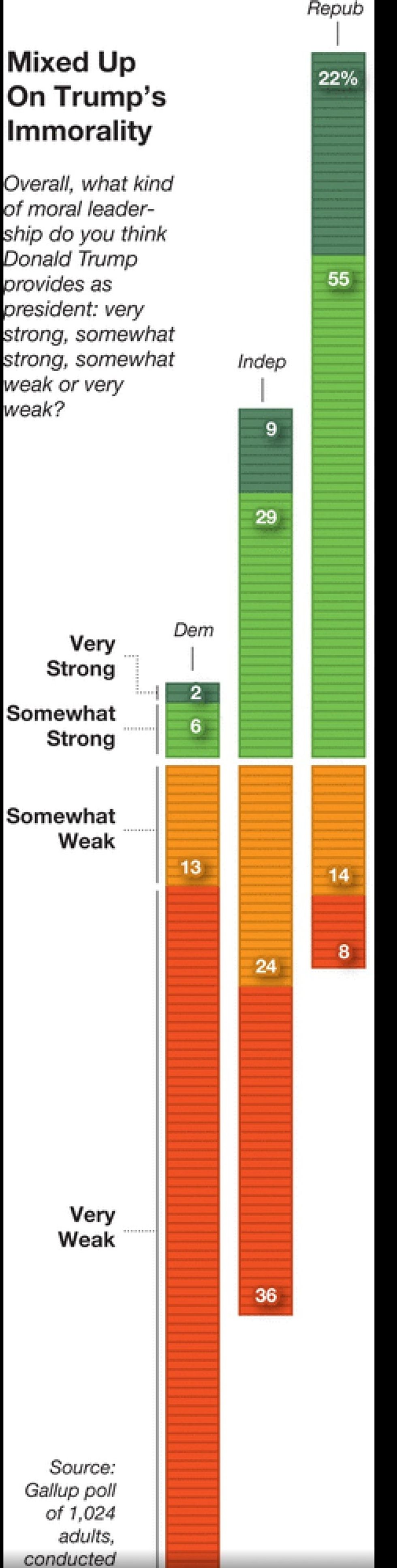 It is only in that alternate reality, in that other world, that Gallup could report poll results last week that found that three-quarters of Republicans believe that Trump provides strong moral leadership as president.These are the same Republicans who told Gallup last month that they thought that the ethical standards of the thoroughly unethical Trump administration officials were excellent or good (71 percent) as opposed to not good or poor (27 percent).