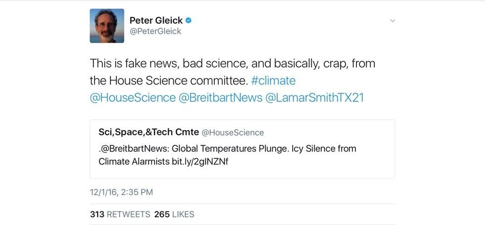 That's what happened on Thursday, when the official, verified House Science Committee account spread an article based on bad science through their Twitter feed. Not only does the article peddle misinformation in order to deny the reality of climate change, but it was published by Breitbart news — which is notorious for its links to white nationalism, misogyny, and antisemitism. The site also has a long history of insistent climate change denial.The article purports to counter NASA's exhaustive evidence that we are currently living in the hottest year in modern record-keeping. The article bases its claims on a 1ºF (0.6ºC) drop in land temperatures.