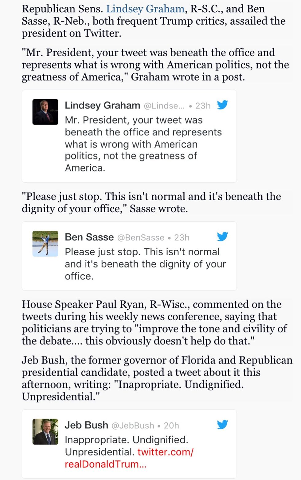 According to the Washington Post, more than three dozen Republicans and Democrats in Congress issued tweets of their own expressing disgust, calling the remark "unpresidential," "vile, sexist and unbecoming of an American leader," "divisive," "unhinged and shameful" and "amazingly graceless."