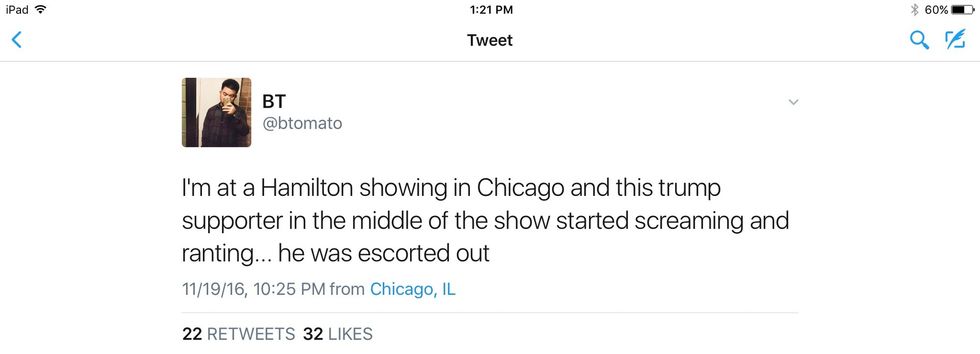 There has been some debate here tonight about manners, is booing appropriate? Let love and the theatre enlighten him and heal this divide. I disagree. Brandon Victor Dixon delivered a terrific, polite and strong statement on behalf of the HAMILTON company at the curtain call and before the appeal. Well done and in that space, brave and appropriate.