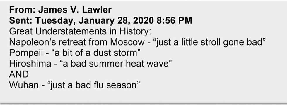Dr. James Lawler, an infectious disease doctor at the University of Nebraska who served in the White House under President George W. Bush and as an adviser to President Barack Obama, was also a regular participant in the email chain. He stayed in regular communication with federal officials as the United States attempted to figure out how to respond to the virus. From the beginning he predicted this would be a major public health event.