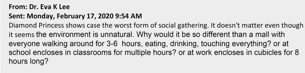 Dr. Eva Lee, a researcher at Georgia Institute of Technology who has frequently worked with the federal government to create infectious disease projections, helped the Red Dawn group do modeling, based on the virus spread on the cruise ship. (Dr. Lee is facing sentencing on federal charges that she falsified the membership certificate behind a $40,000 National Science Foundation grant for unrelated research.)