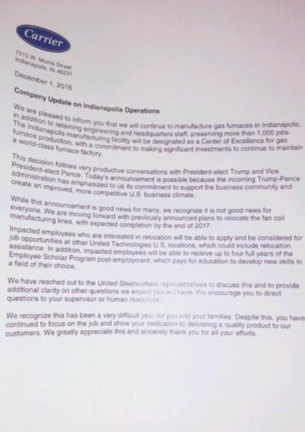 An aside, here is the Carrier letter outlining the situation about jobs moving to Mexico to the employees who will lose their jobs. This letter was sent on the day of Trump's visit. And yes, Trump owns Carrier stock. And yes, the union representing the Carrier workers was shut out from the negotiations.
