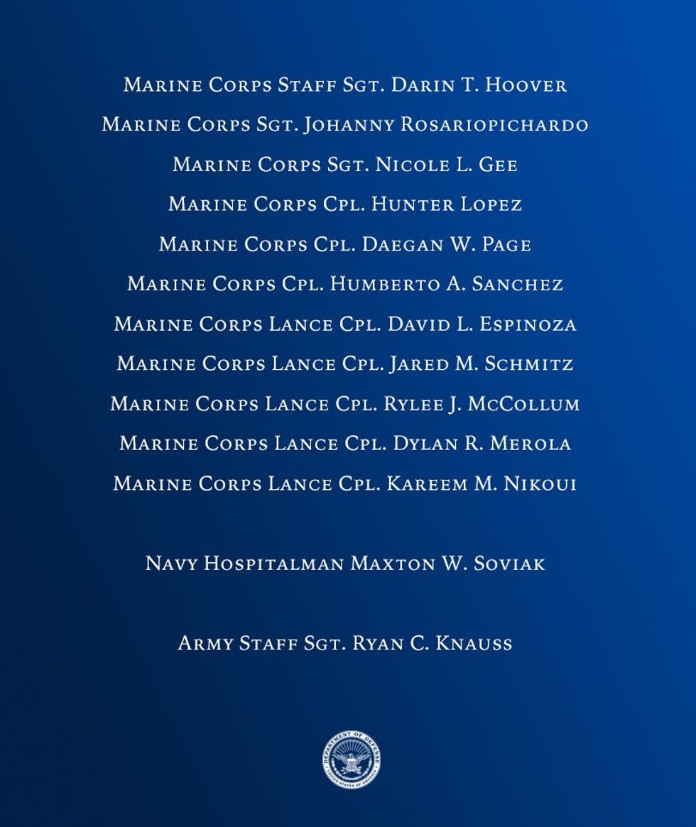 These 13 men and women made the ultimate sacrifice so that others could live. They were and will be forever remembered as heroes. My heart and my thoughts are with their families, especially today. They, too, have made the ultimate sacrifice. https://t.co/mImf4Jv1q6